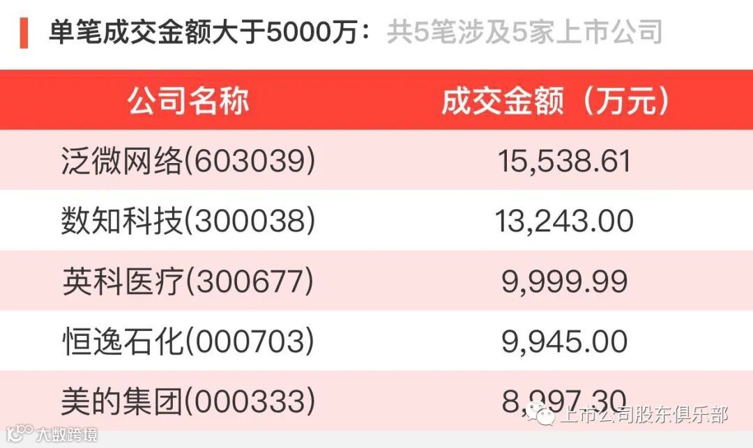 2020年10月20日,大宗交易成交金额22.35亿元,交易股票数49只,成交笔数88笔,流通股平均成交折价率96.48%,成交数量11886万股。