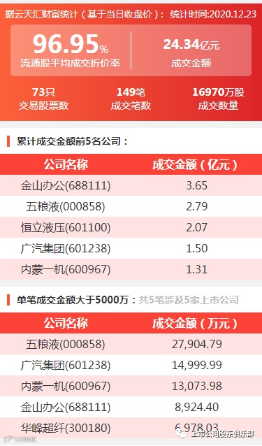 2020年12月23日,大宗交易成交金额24.34亿元,交易股票数73只,成交笔数149笔,流通股平均成交折价率96.95%,成交数量16970万股。