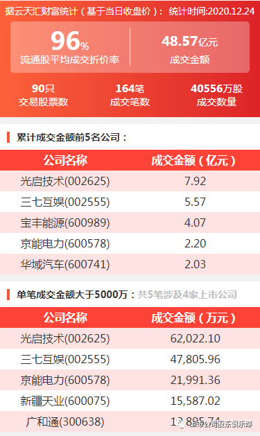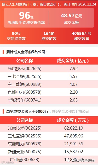 2020年12月24日,大宗交易成交金额48.57亿元,交易股票数90只,成交笔数164笔,流通股平均成交折价率96%,成交数量40556万股。