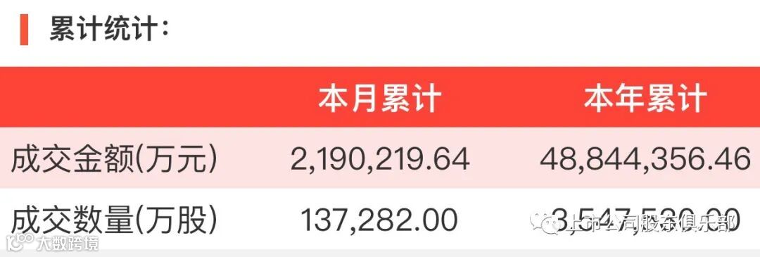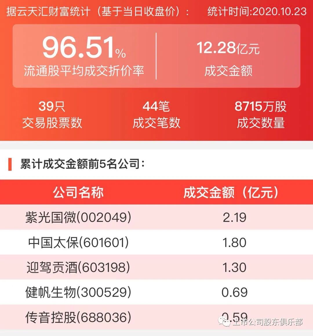 2020年10月23日,大宗交易成交金额12.28亿元,交易股票数39只,成交笔数44笔,流通股平均成交折价率96.51%,成交数量8715万股。