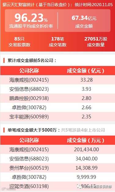 2020年11月5日,大宗交易成交金额67.34亿元,交易股票数85只,成交笔数178笔,流通股平均成交折价率96.23%,成交数量27051万股。