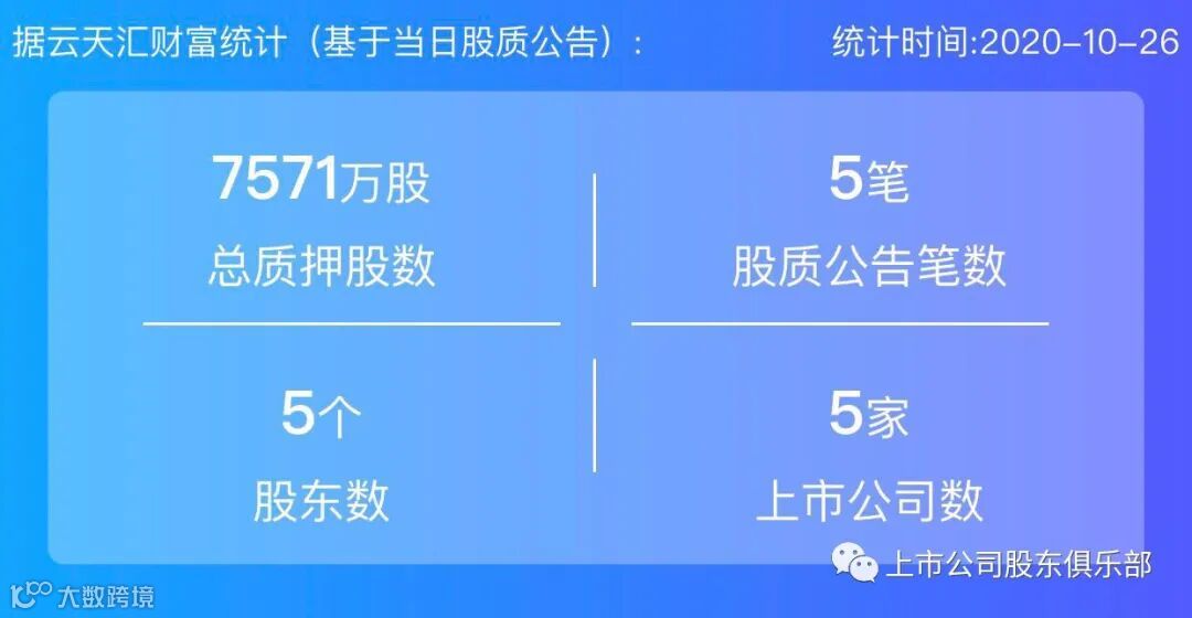 2020年10月26日,股票质押总质押股数7571万股,上市公司数5家,股质公告笔数5笔,股东数5个。