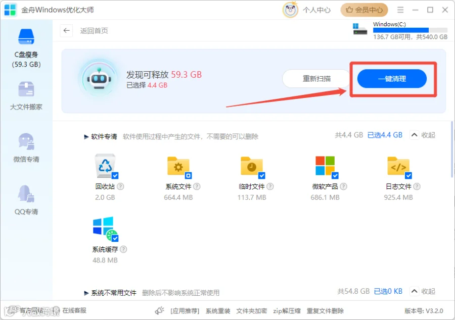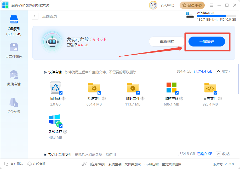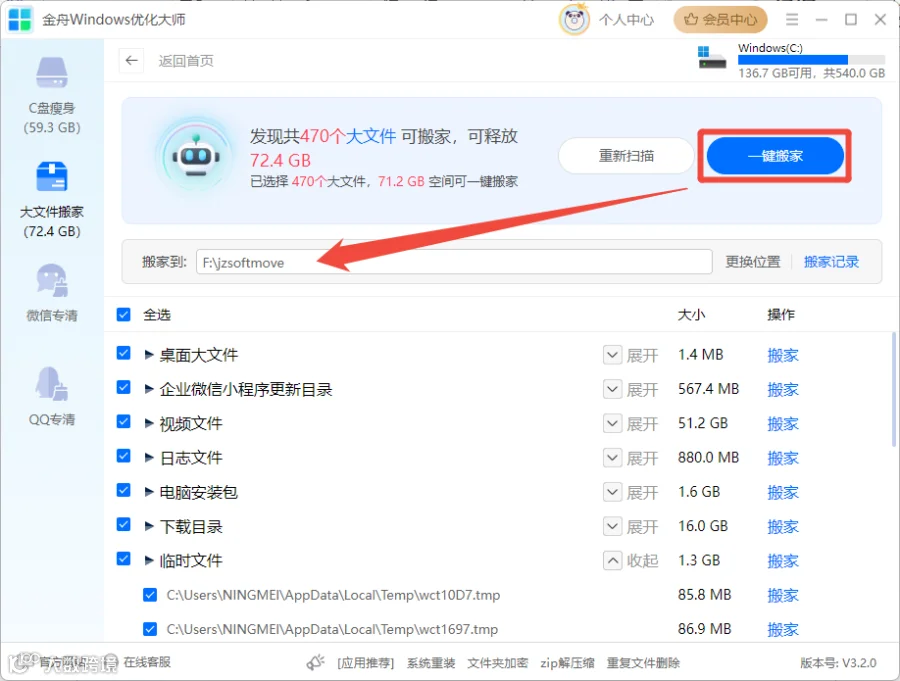 (可选)使用其他优化功能:清理完成后,你还可以根据需要尝试“大文件搬家”、“微信专清”“QQ专清”释放更多内存空间;