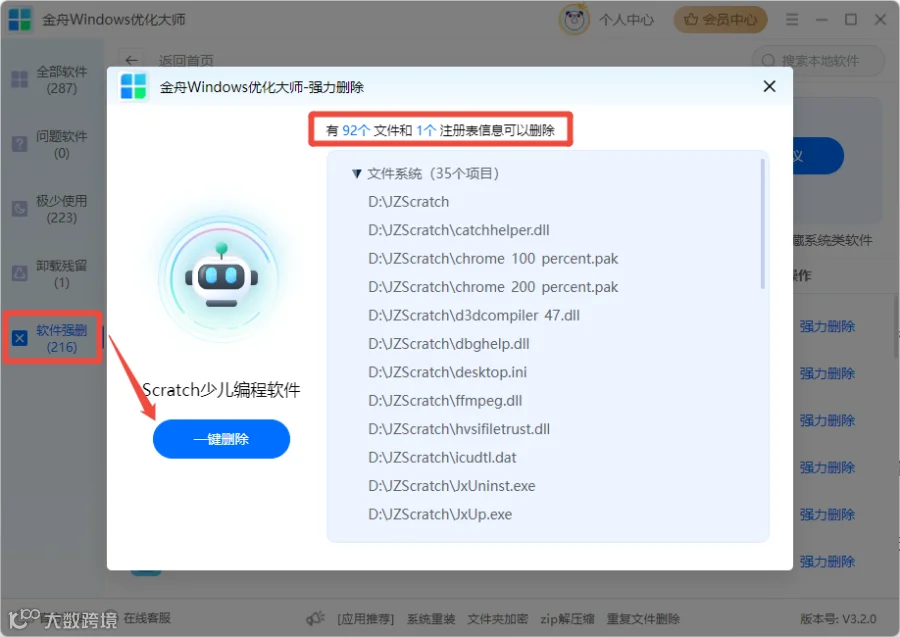 还可结合软件管理的“卸载残留”“软件强删”等功能进一步优化系统。