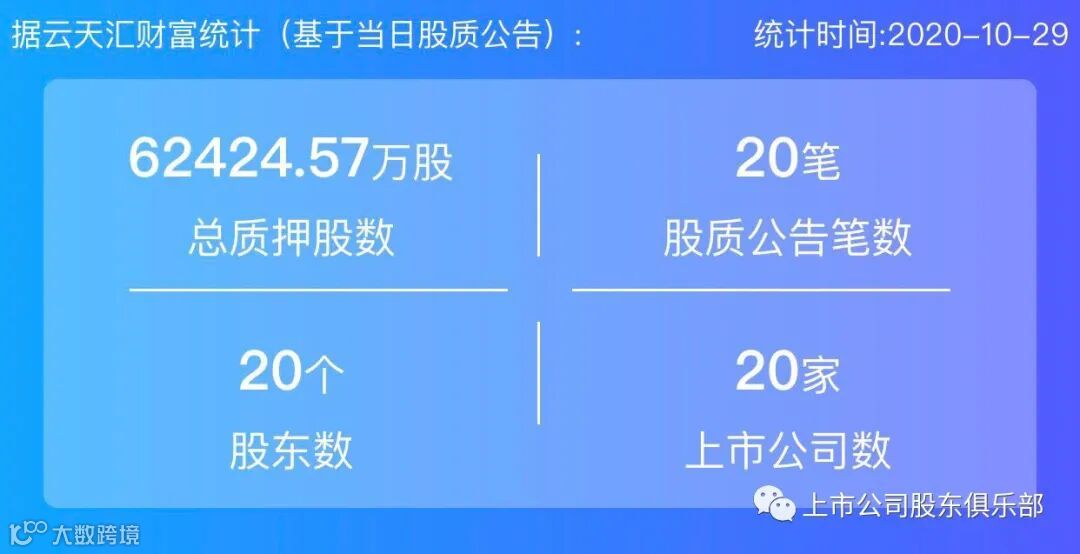 2020年10月29日,股票质押总质押股数62424.57万股,上市公司数20家,股质公告笔数20笔,股东数20个。