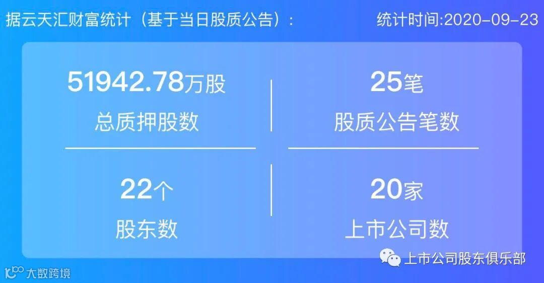 2020年9月23日,股票质押总质押股数51942.78万股,上市公司数20家,股质公告笔数25笔,股东数22个。