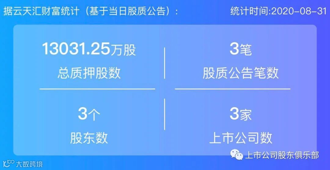 2020年8月31日,股票质押总质押股数13031.25万股,上市公司数3家,股质公告笔数3笔,股东数3个。