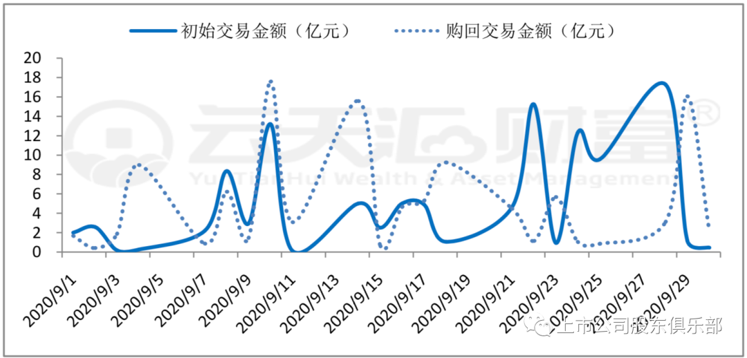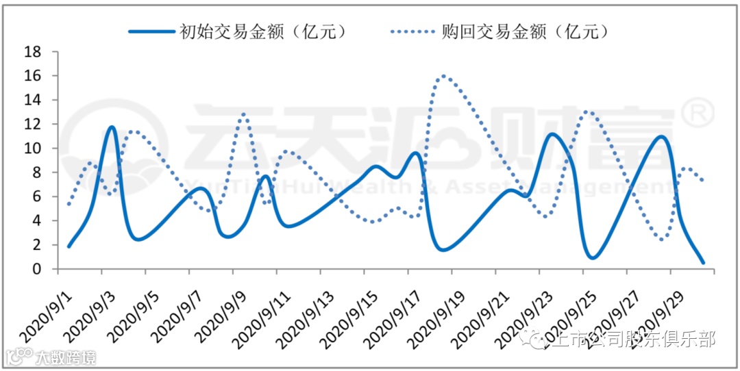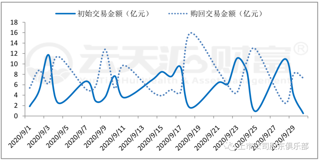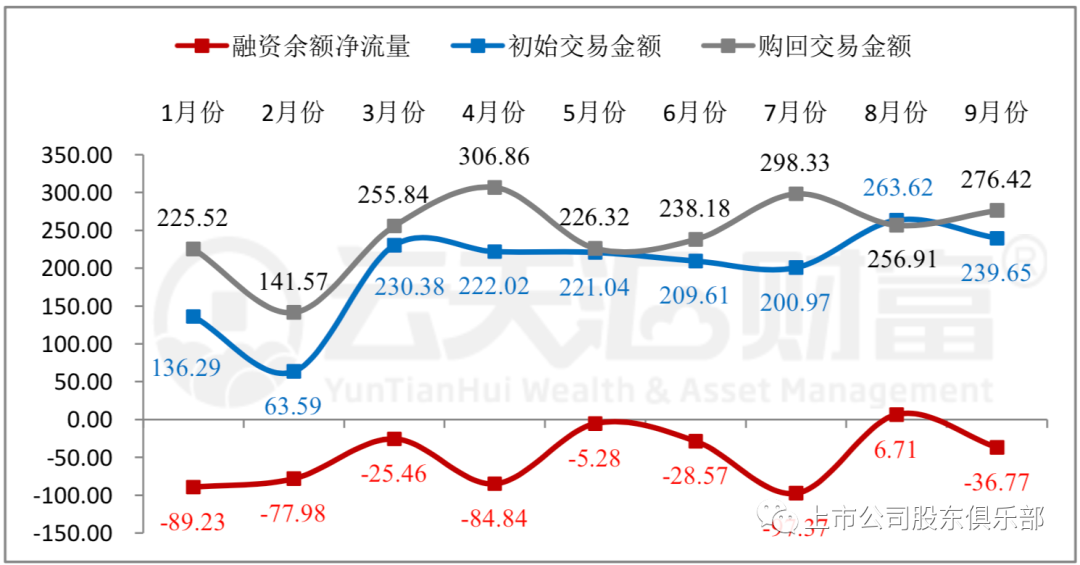 区分交易所来看,9月份上交所场内质押初始交易金额为111.74亿元, 初始交易金额相比8月份增加34.95%,这是今年以来上交所初始交易金额最多的一个月份,是初始交易金额最少的2月份的4.5倍左右。9月份购回交易金额与同月初始交易金额基本持平,为111.88亿元,融资余额净流出0.14亿元。9月份深交所场内股票质押初始交易金额为127.91 亿元,相比上月减少29.26%,购回交易金额为164.54亿元,融资余额净流出36.63亿元。