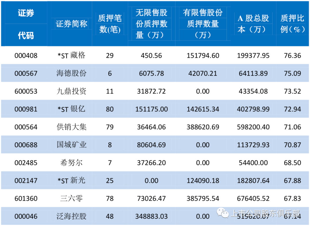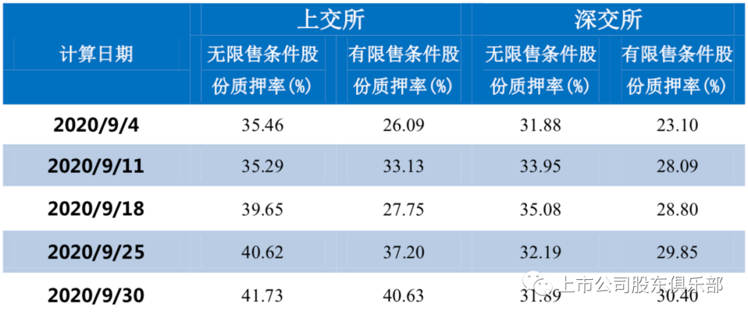注:①质押数量的计算范围为“场外质押登记(含柜台质押登记、私募可交换债发行中涉及的预备换股股票质押登记,下同)、股票质押式回购交易”;②质押比例计算公式为:(场外质押登记股数+股票质押式回购交易数量)/上市公司A股总股本;③数据来源:中国结算官网数据