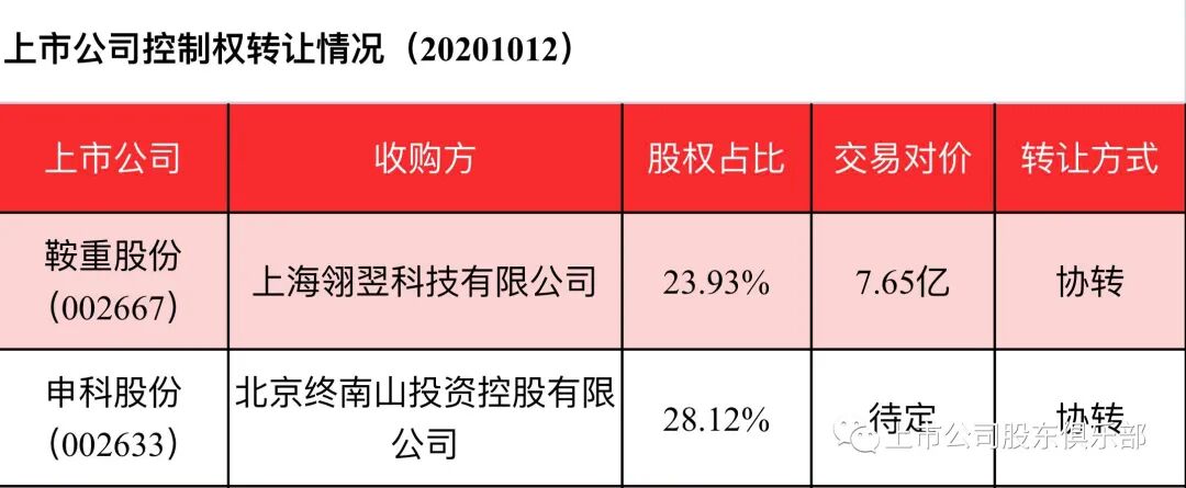 2020年10月12日,2家上市公司公告计划转让控制权;3家上市公司公告计划现金收购资产。