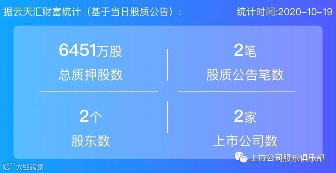 2020年10月19日,股票质押总质押股数6451万股,上市公司数2家,股质公告笔数2笔,股东数2个。