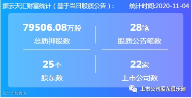 2020年11月4日,股票质押总质押股数79506.08万股,上市公司数22家,股质公告笔数28笔,股东数25个。
