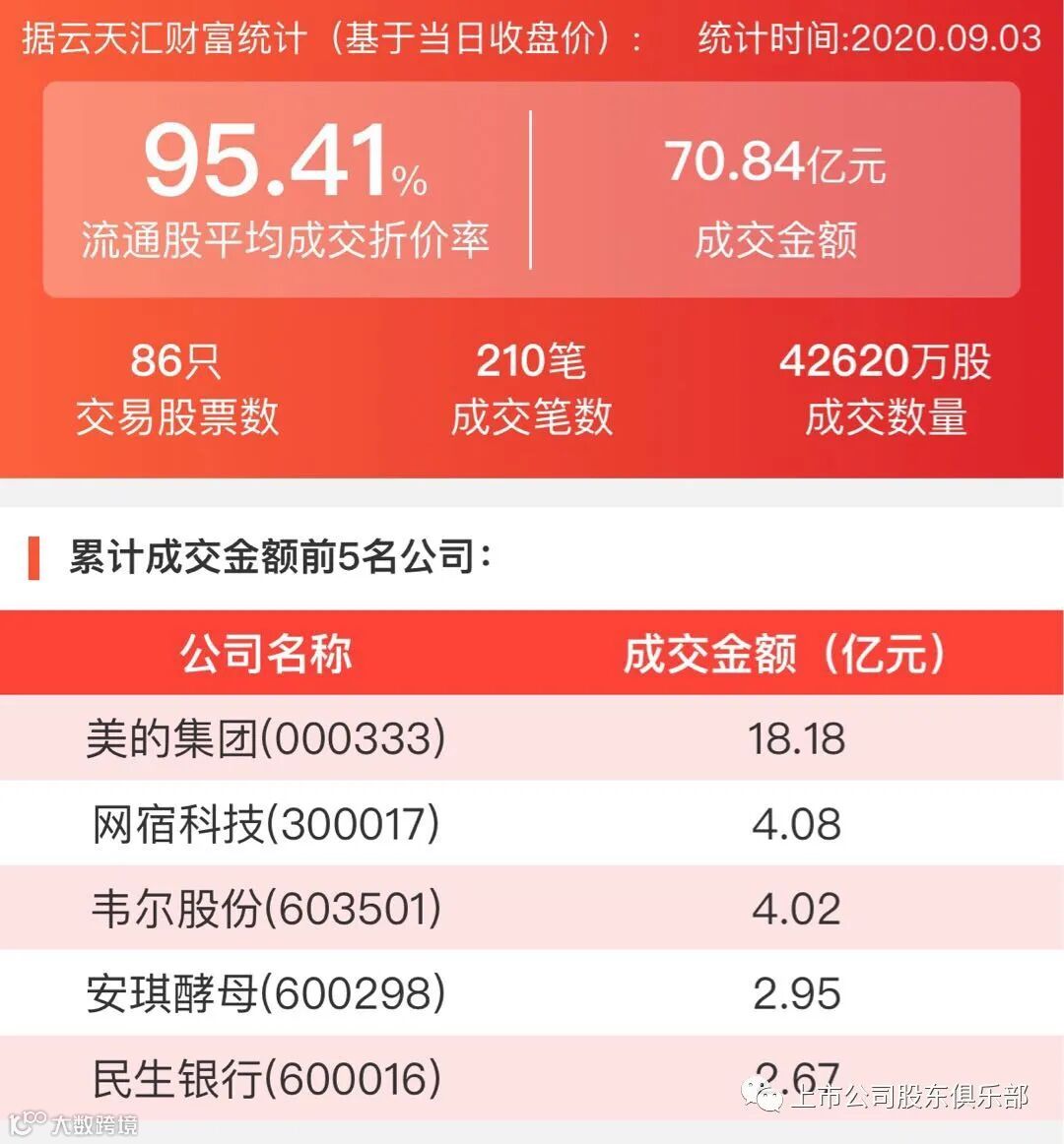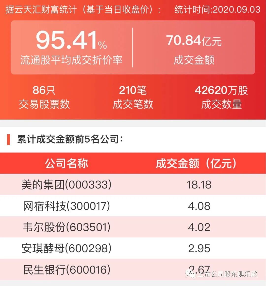 2020年9月3日,大宗交易成交金额70.84亿元,交易股票数86只,成交笔数210笔,流通股平均成交折价率95.41%,成交数量42620万股。