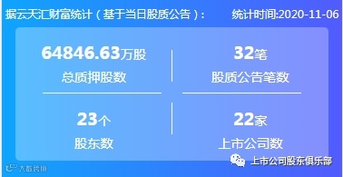 2020年11月6日,股票质押总质押股数64846.63万股,上市公司数22家,股质公告笔数32笔,股东数23个。