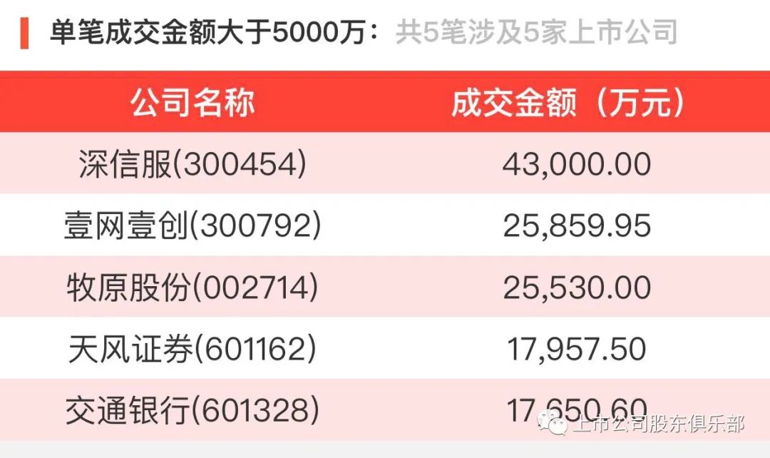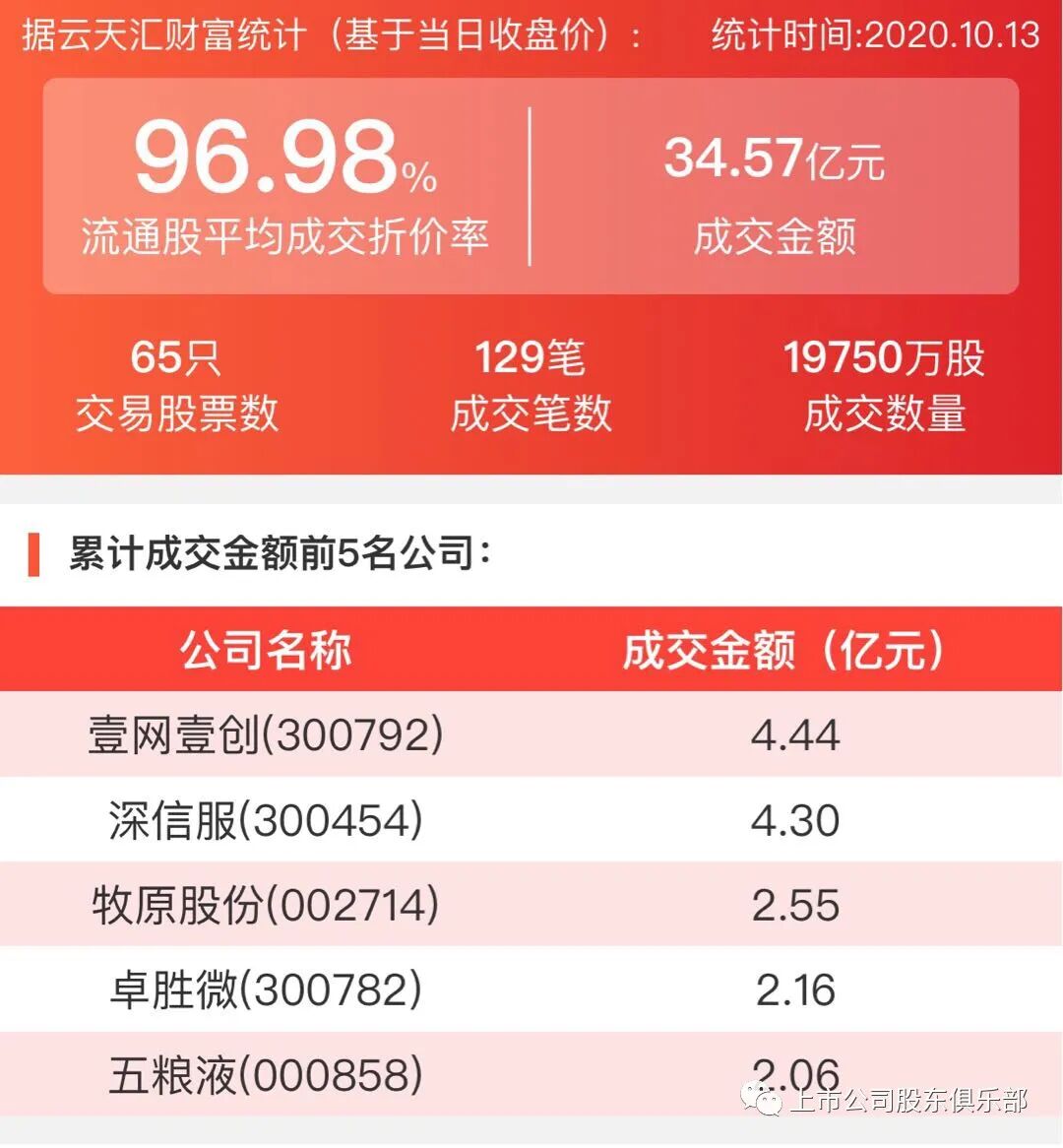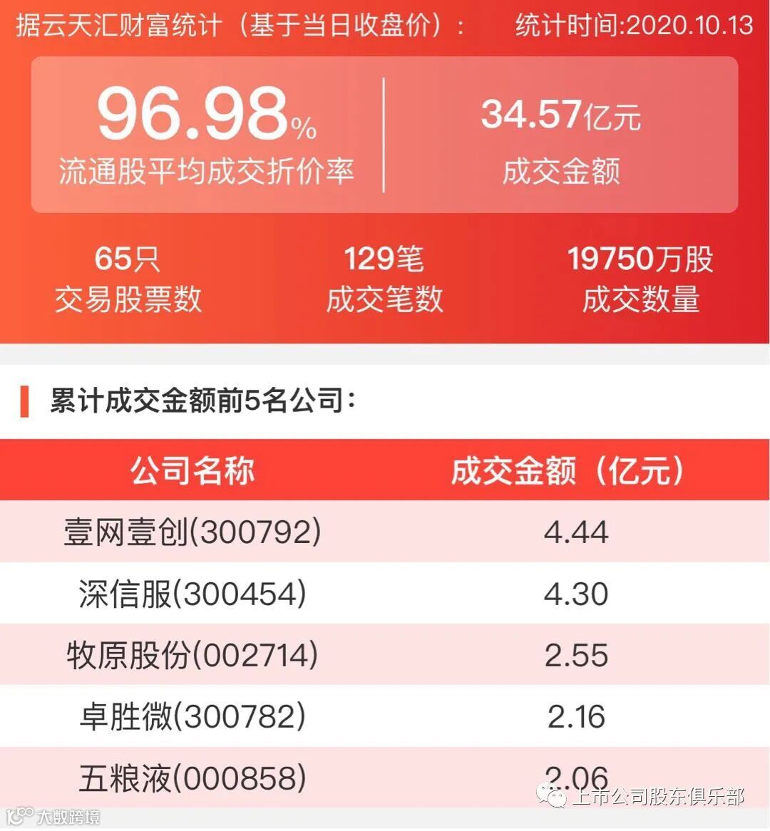2020年10月13日,大宗交易成交金额34.57亿元,交易股票数65只,成交笔数129笔,流通股平均成交折价率96.98%,成交数量19750万股。