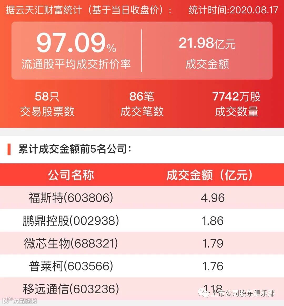 2020年8月17日,大宗交易成交金额21.98亿元,交易股票数58只,成交笔数86笔,流通股平均成交折价率97.09%,成交数量7742万股。