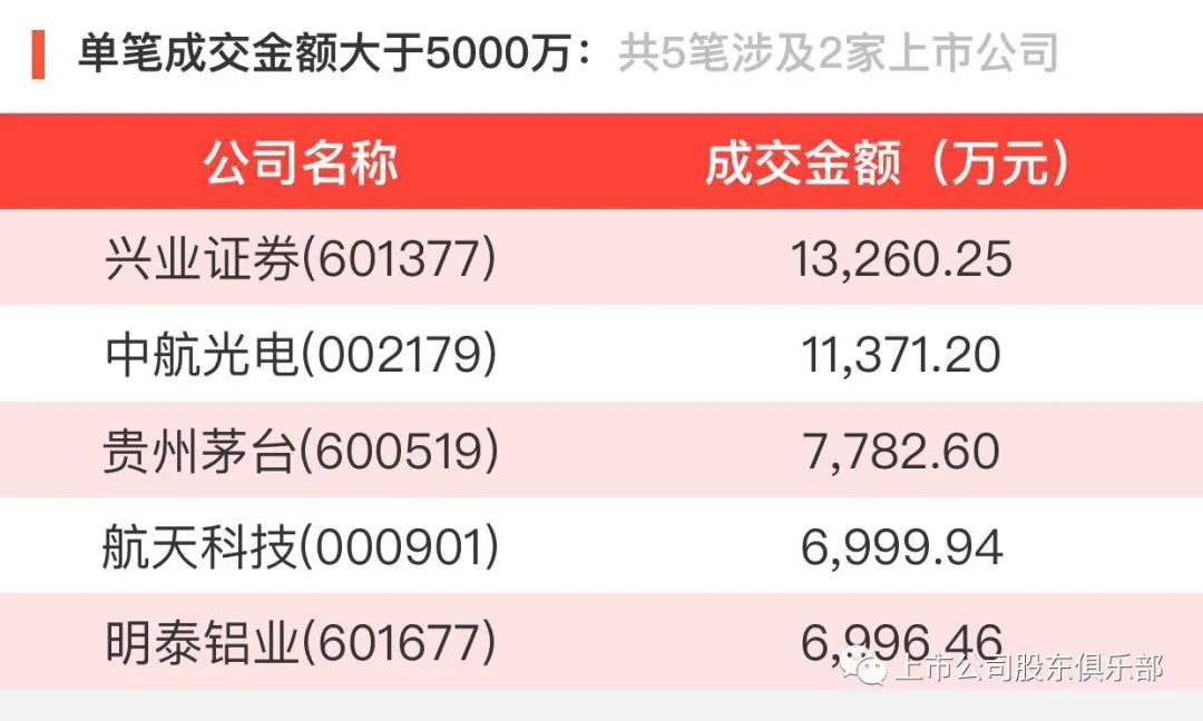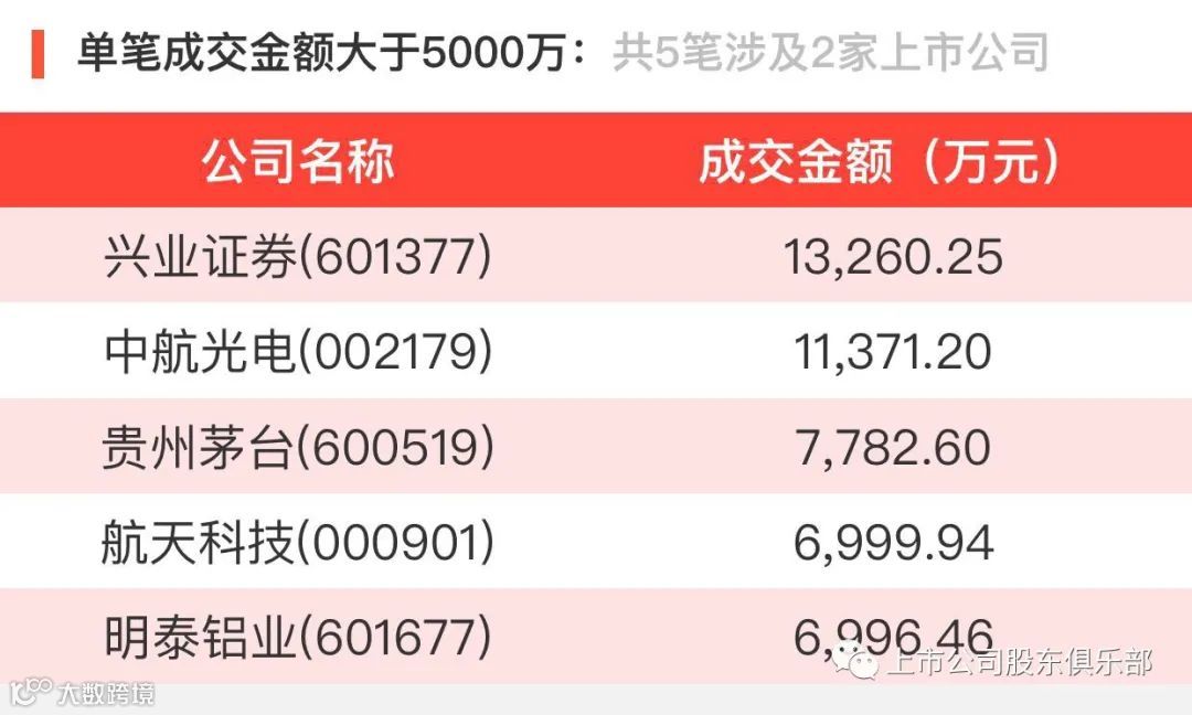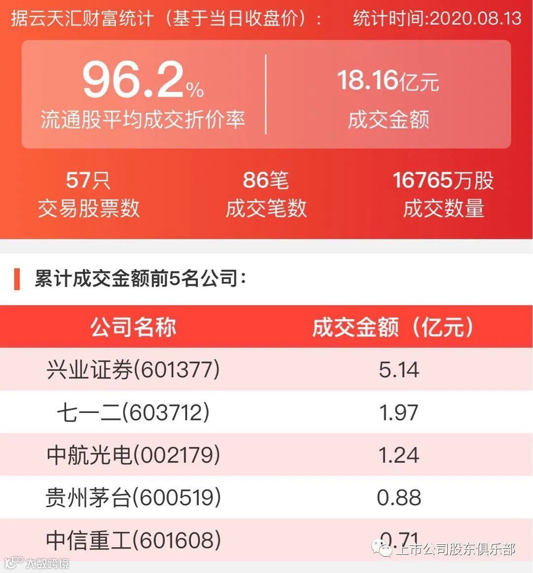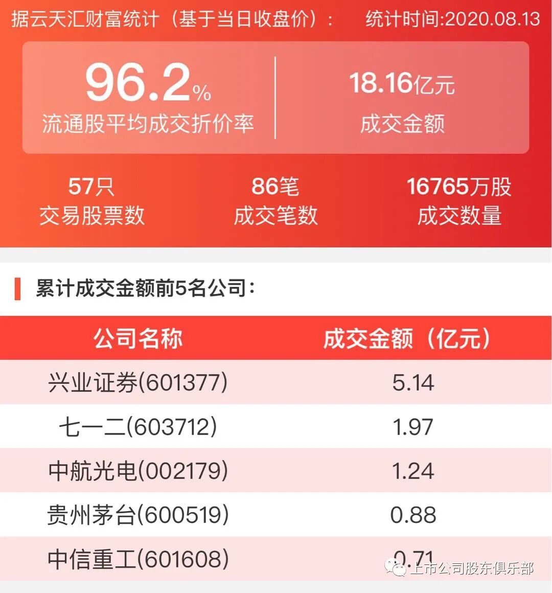2020年8月13日,大宗交易成交金额18.16亿元,交易股票数57只,成交笔数86笔,流通股平均成交折价率96.2%,成交数量16765万股。