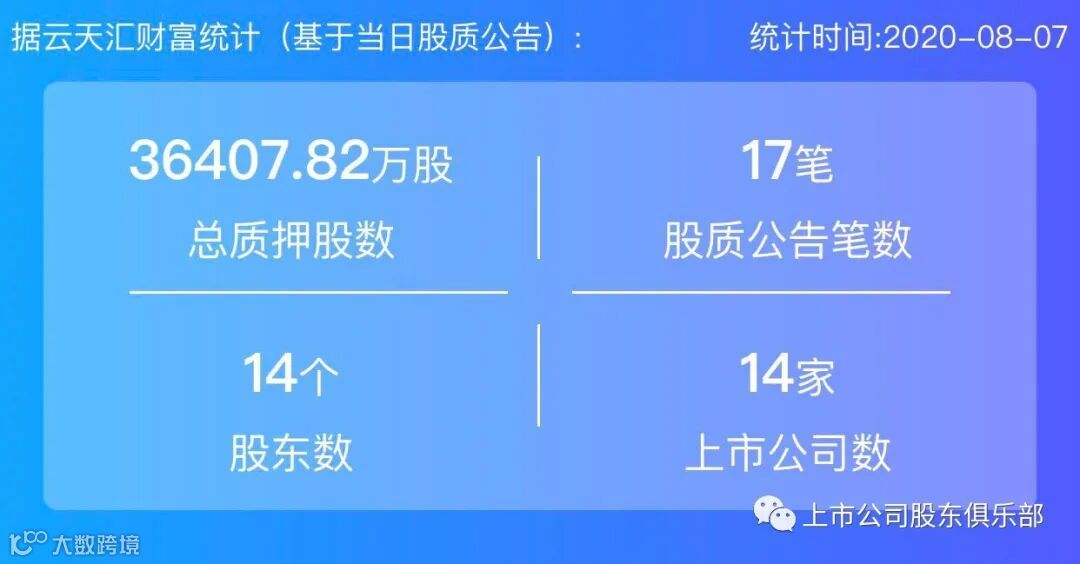 2020年8月7日,股票质押总质押股数36407.82万股,上市公司数14家,股质公告笔数17笔,股东数14个。