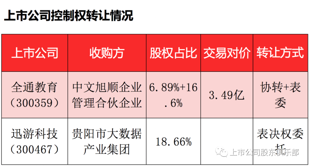 2020年9月8日,全通教育(300359)、迅游科技(300467)公告计划转让控制权;2家上市公司公告现金收购资产;无上市公司出售资产案例。