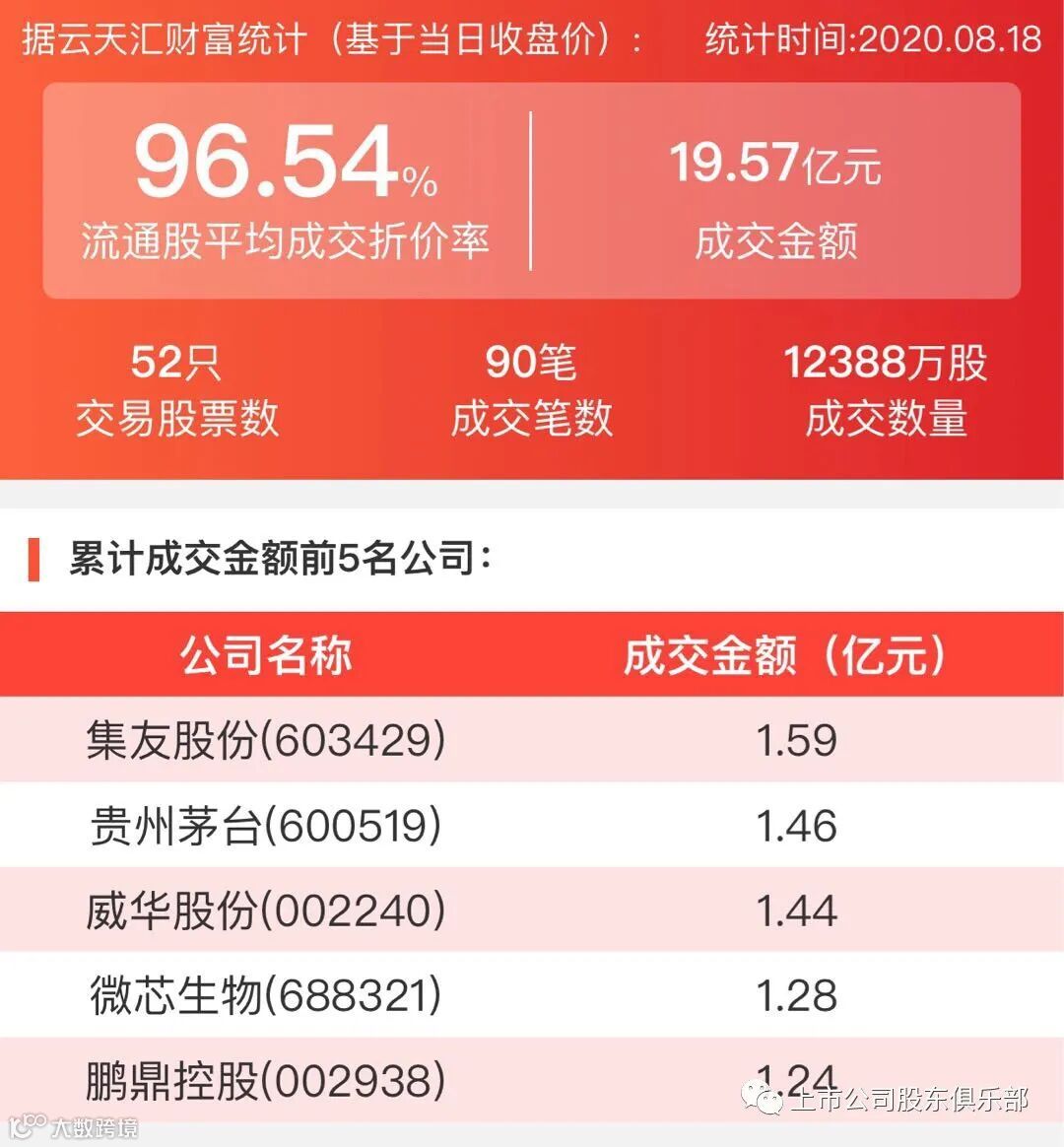 2020年8月18日,大宗交易成交金额19.57亿元,交易股票数52只,成交笔数90笔,流通股平均成交折价率96.54%,成交数量12388万股。