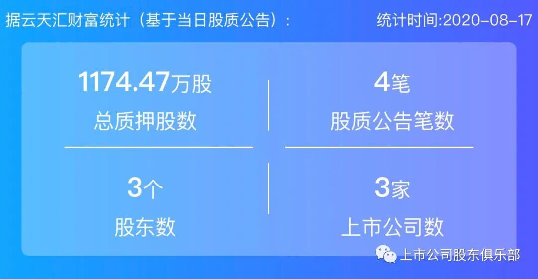 2020年8月17日,股票质押总质押股数1174.47万股,上市公司数3家,股质公告笔数4笔,股东数3个。