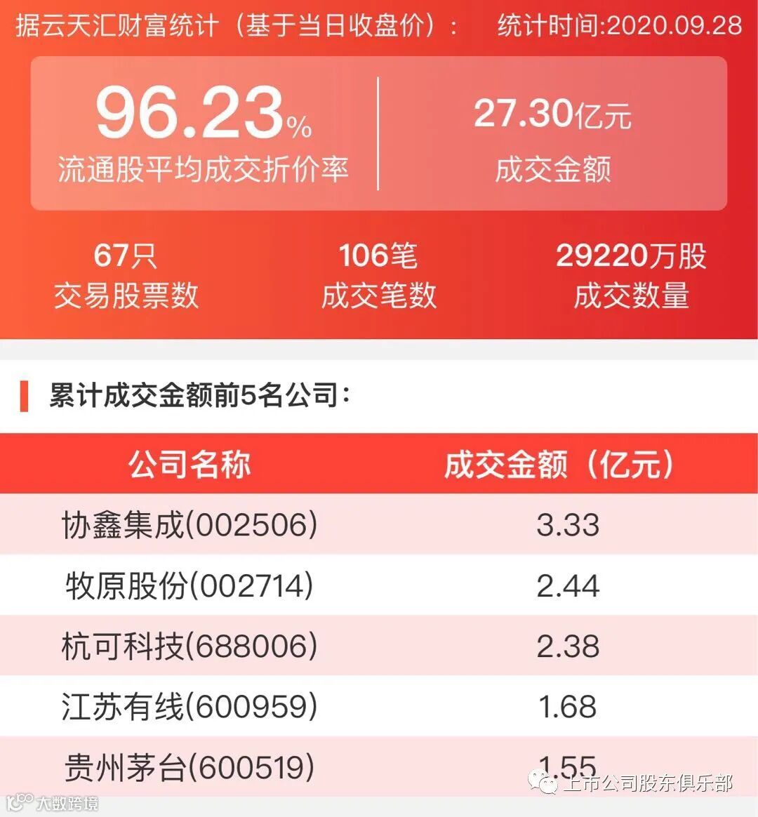 2020年9月28日,大宗交易成交金额27.3亿元,交易股票数67只,成交笔数106笔,流通股平均成交折价率96.23%,成交数量29220万股。