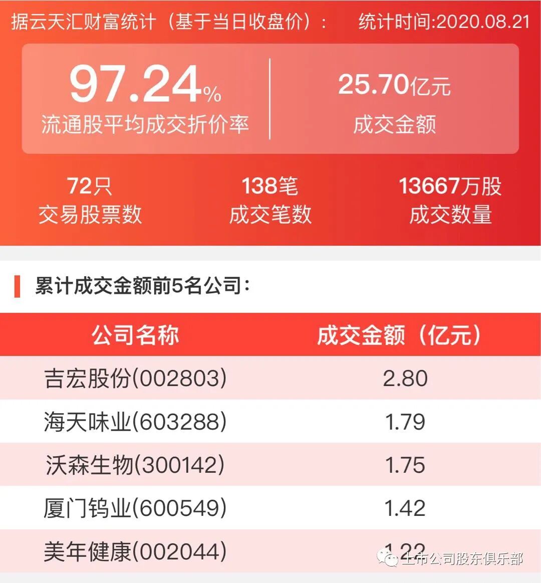 2020年8月21日,大宗交易成交金额25.7亿元,交易股票数72只,成交笔数138笔,流通股平均成交折价率97.24%,成交数量13667万股。
