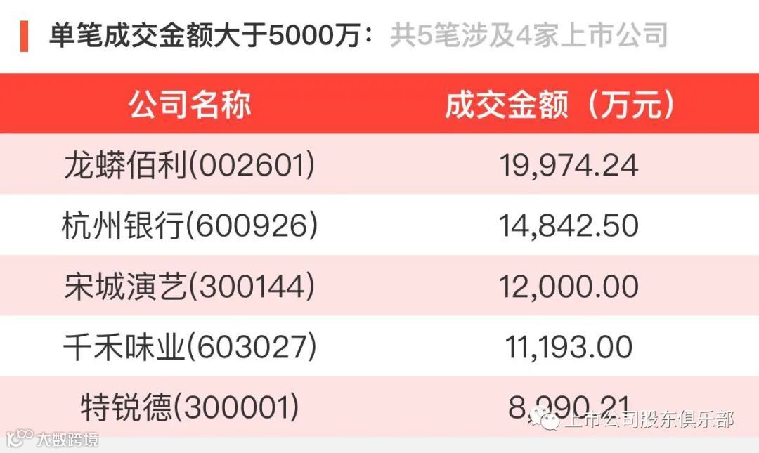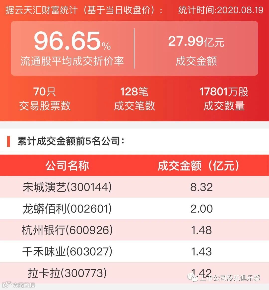 2020年8月19日,大宗交易成交金额27.99亿元,交易股票数70只,成交笔数128笔,流通股平均成交折价率96.65%,成交数量17801万股。