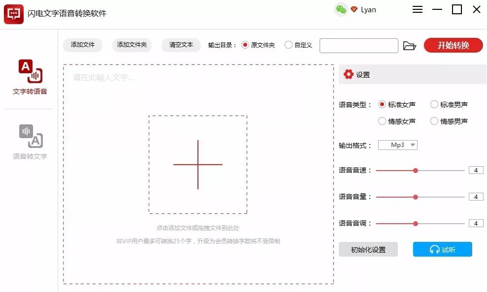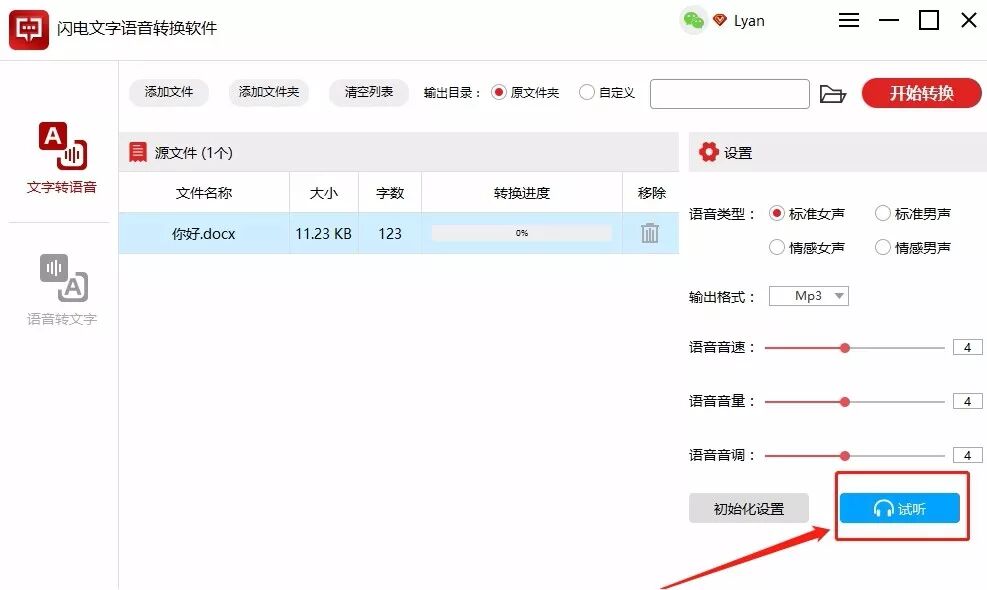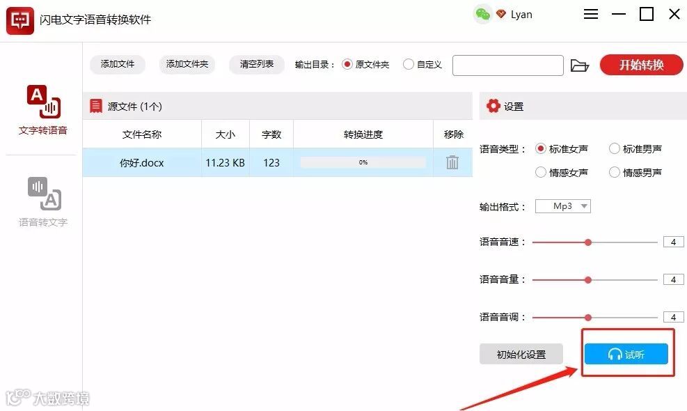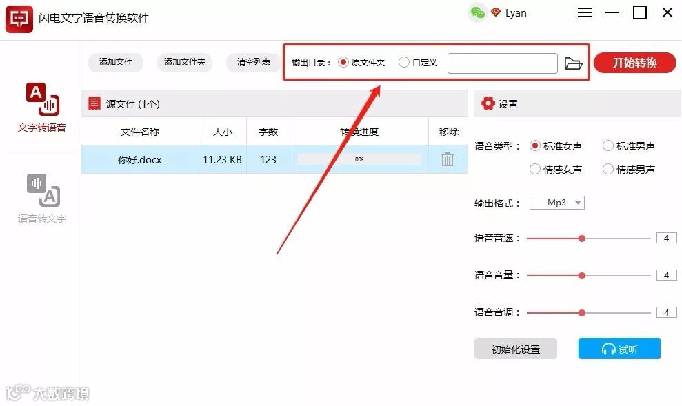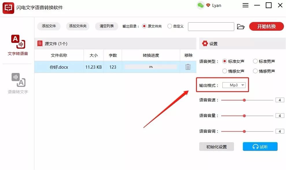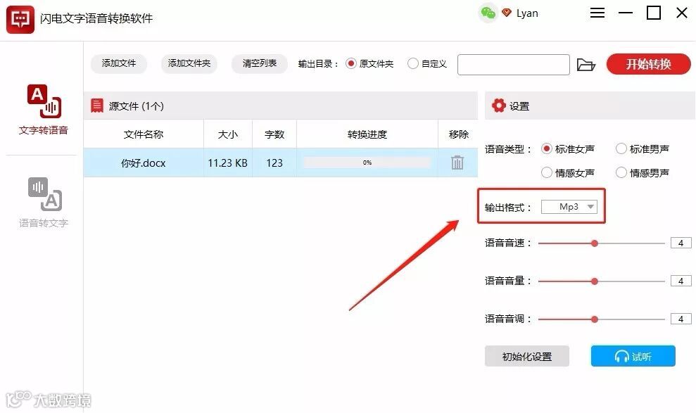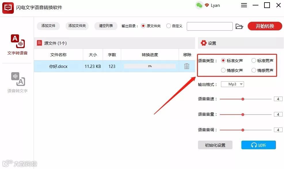 第三步、成功上文件后,在软件的右下方设置语音类型。