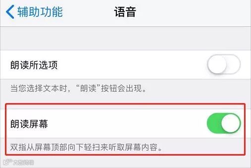 而当你勾选【朗读屏幕】,这样当你双指从屏幕顶部向下轻扫来听取屏幕的内容,然后就可以直接朗读屏幕的内容了。