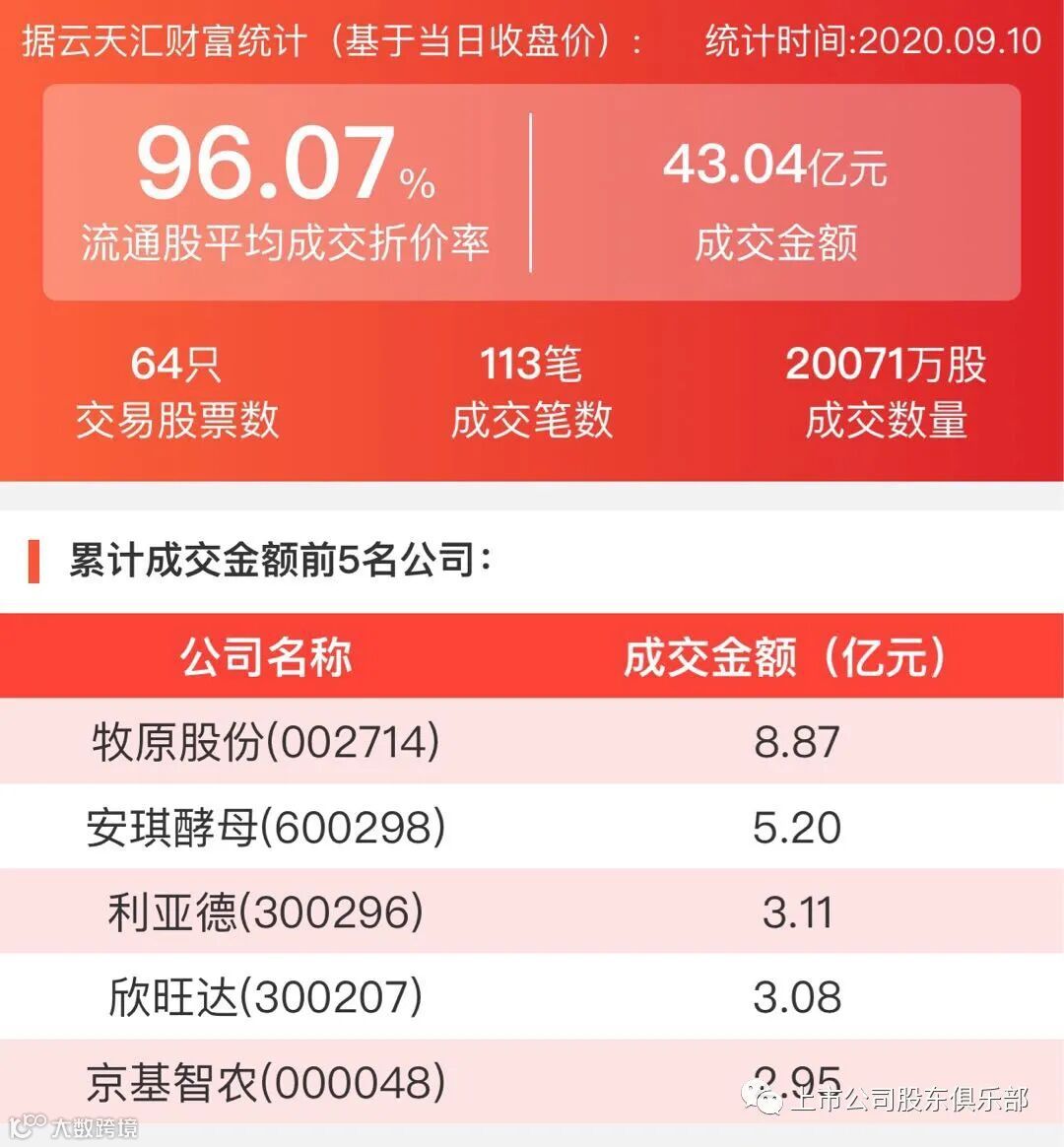 2020年9月10日,大宗交易成交金额43.04亿元,交易股票数64只,成交笔数113笔,流通股平均成交折价率96.07%,成交数量20071万股。