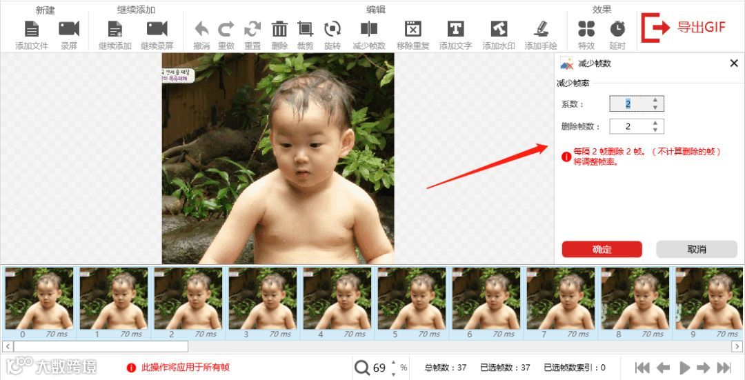 第四步、接下来在这里,我们选择需要删除的帧数,如图所示:这里是每隔2帧就删除2帧画面。删除的帧数越多,文件大小就越小。
