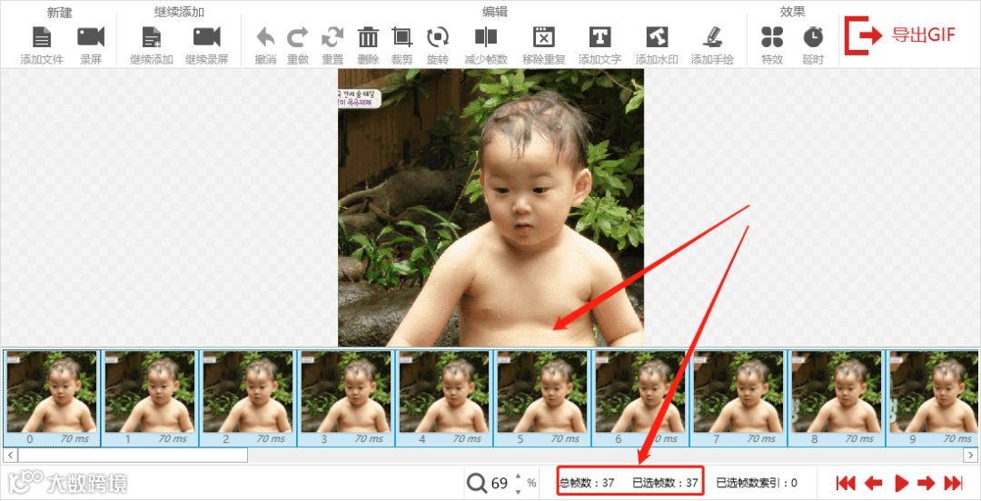 第二步、上传文件后,全选(Ctrl+A)所有帧数,可以看到该表情包共有37帧。