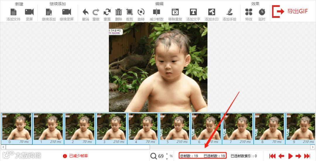 第五步、确定后,在软件的右下方就可以看出,该文件由原来的37帧变成了19帧。