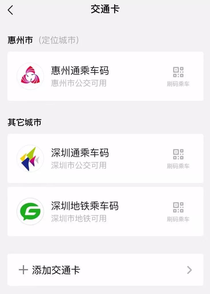 此外,「交通卡」功能还可以根据具体所在城市提供乘车码服务,当微信通过定位确认用户所在城市后,就会根据当前城市是否有乘车码以及提供哪种乘车码服务进行自动切换。