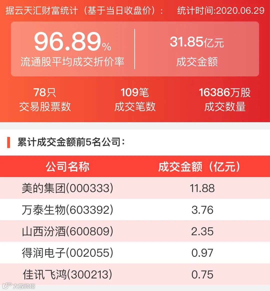 2020年6月29日,大宗交易成交金额31.85亿元,交易股票数78只,成交笔数109笔,流通股平均成交折价率96.89%,成交数量16386万股。