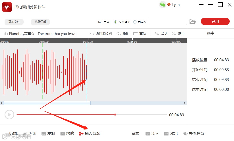 五、接下来,插入新的音频文件,蓝色需要为当前选中的插入位置,点击“插入音频”。
