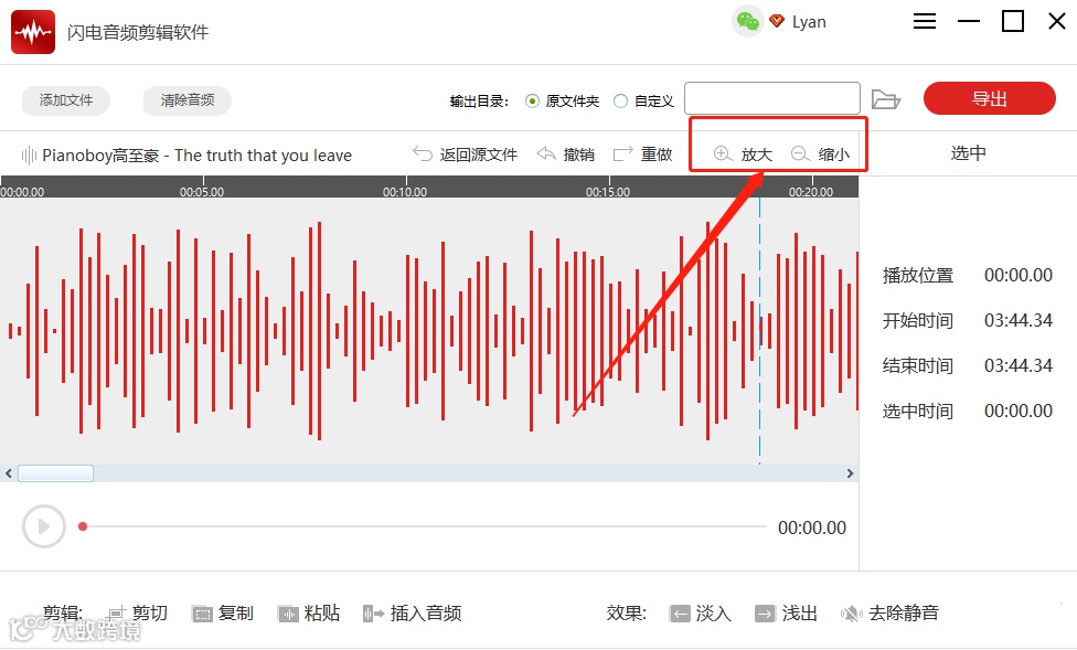 二、如图所示,首先将音频波形图放大至合适大小,方便处理音频片段。