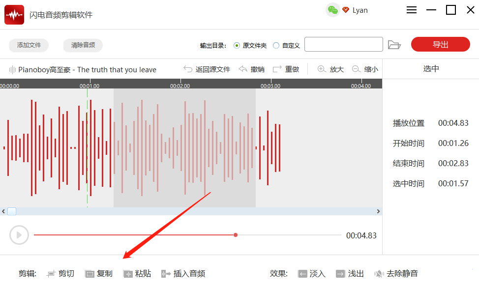 七、然后再像之前一样对音频进行相关操作,当然,也还可以对音频进行其他操作,如复制粘贴等。