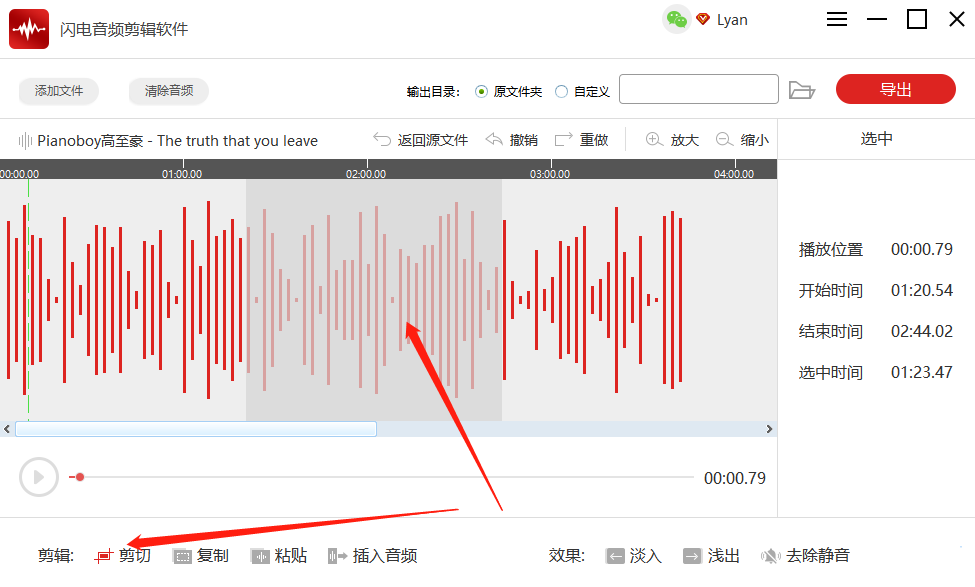 三、根据自己的需要截取音频波形图中的一部分,蓝色虚线为始点,点击然后拖动鼠标即可选择片段。然后,点击“剪切”,删掉即可。