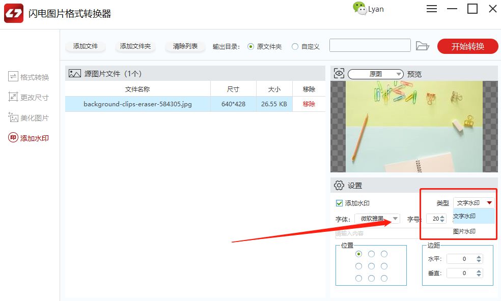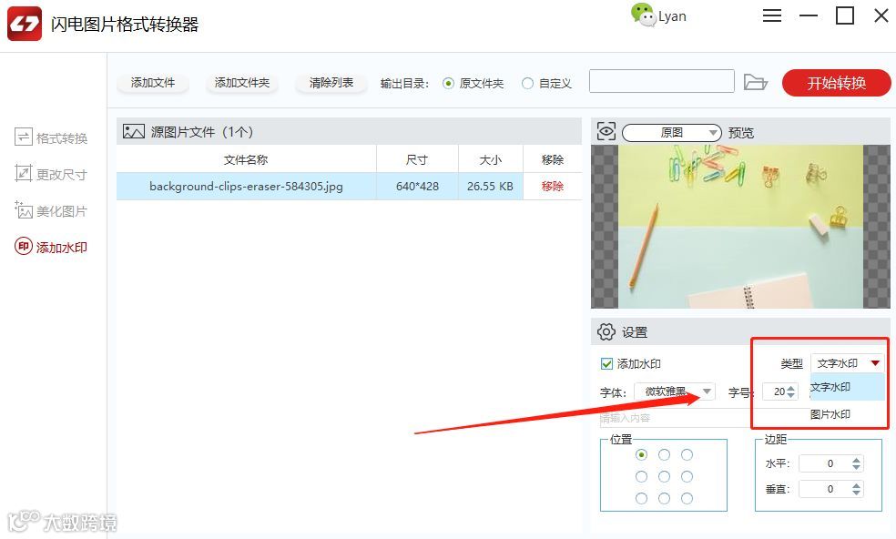 第三步、上传后,我们在软件右下方设置中,设置水印类型为“图片水印”,然后再将事先准备好的图片水印上传到软件上,之后再根据自己的需要调整大小位置等。