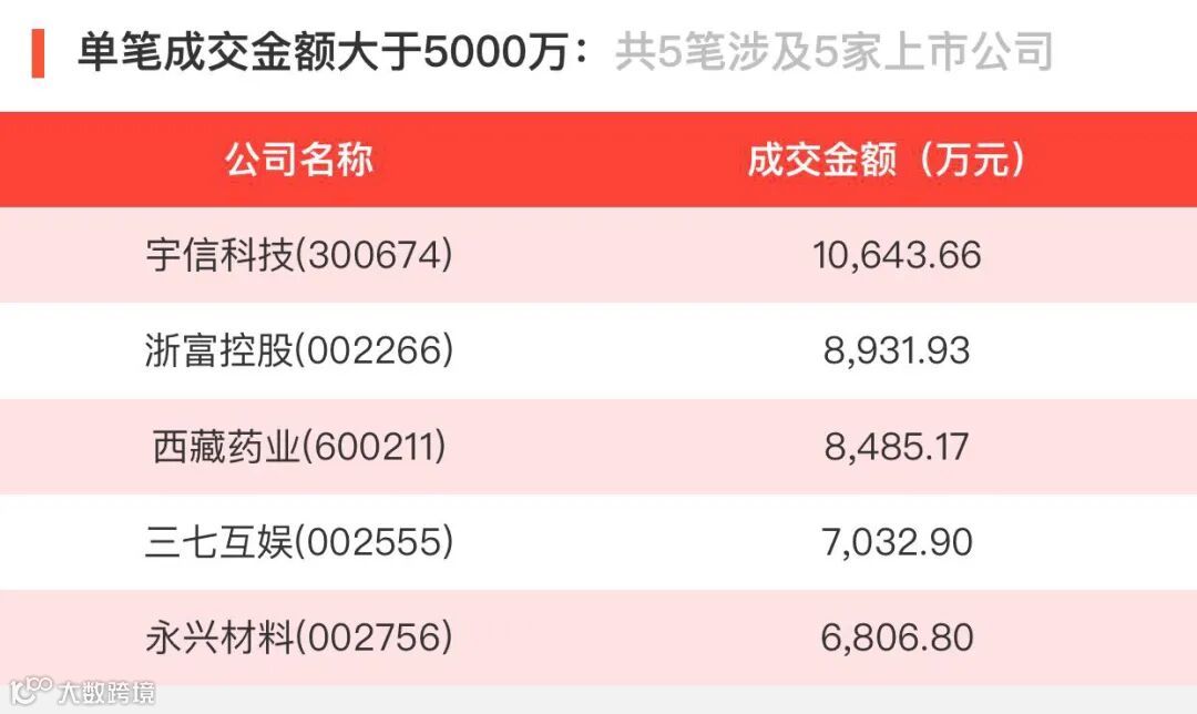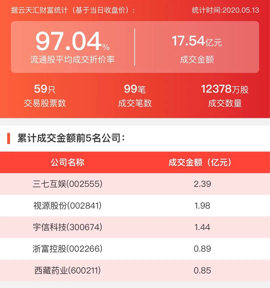 2020年5月13日,大宗交易成交金额17.54亿元,交易股票数59只,成交笔数99笔,流通股平均成交折价率97.04%,成交数量12378万股。