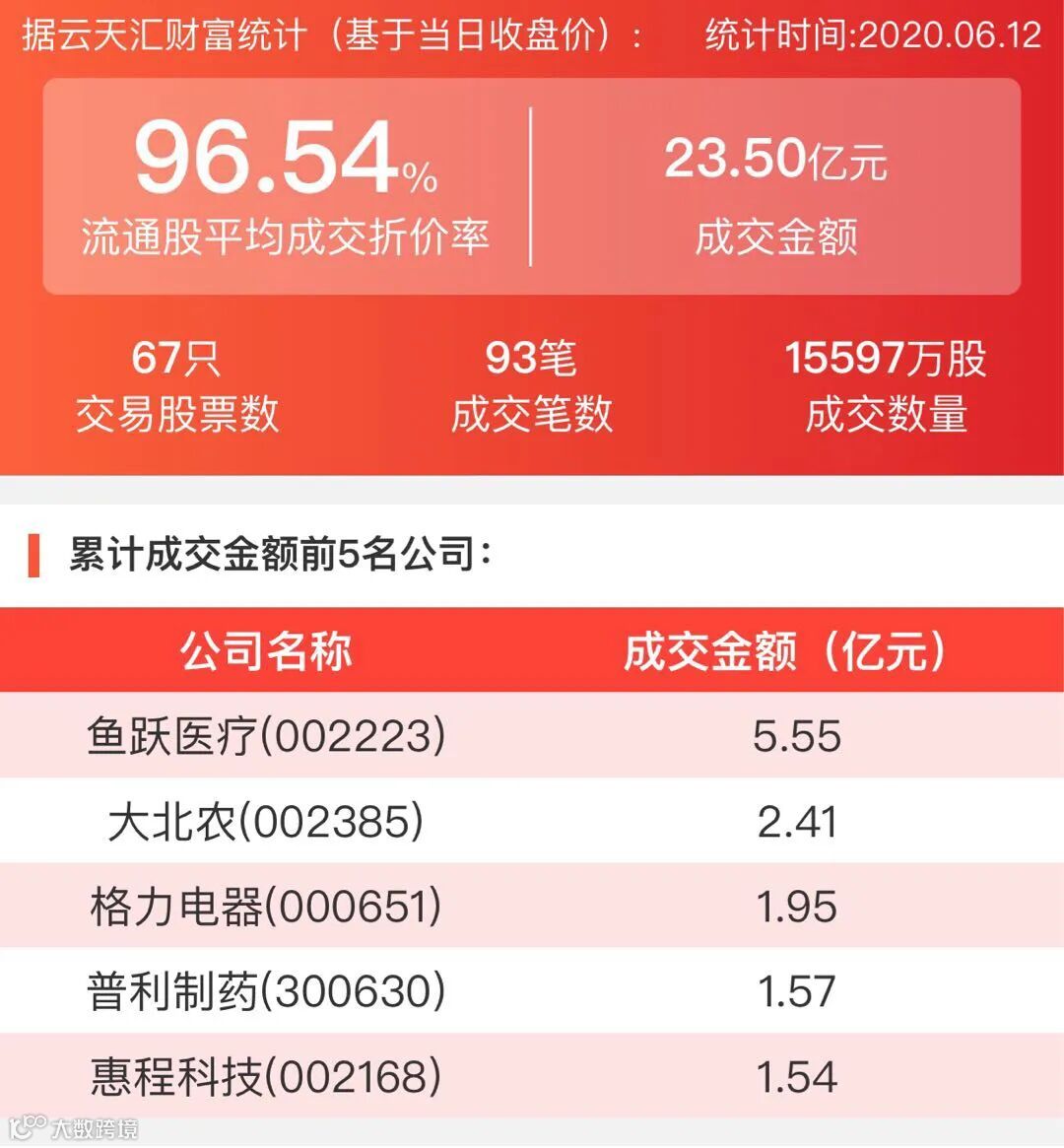 2020年6月12日,大宗交易成交金额23.5亿元,交易股票数67只,成交笔数93笔,流通股平均成交折价率96.54%,成交数量15597万股。