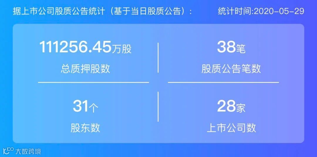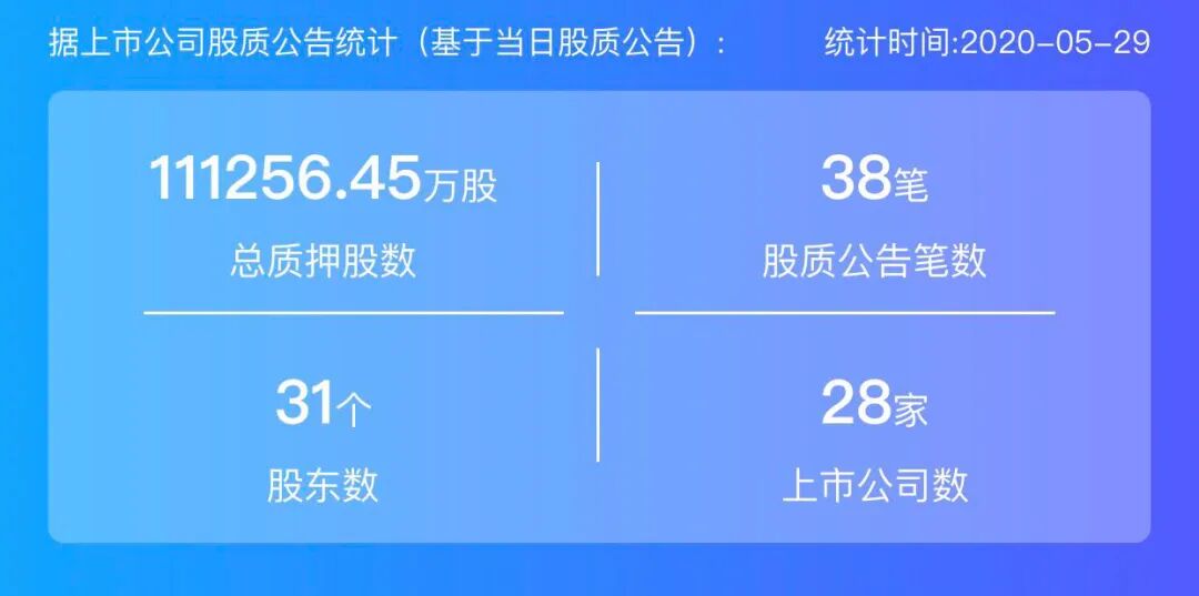 2020年5月29日,股票质押总质押股数111256.45万股,上市公司数28家,股质公告笔数38笔,股东数31个。
