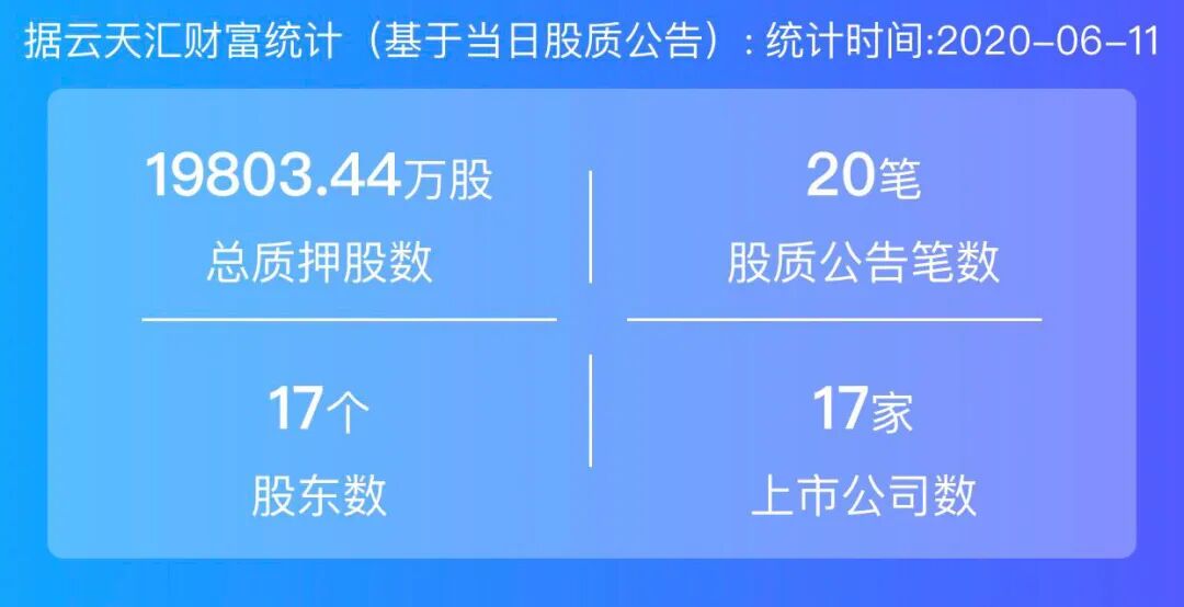 2020年6月11日,股票质押总质押股数19803.44万股,上市公司数17家,股质公告笔数20笔,股东数17个。