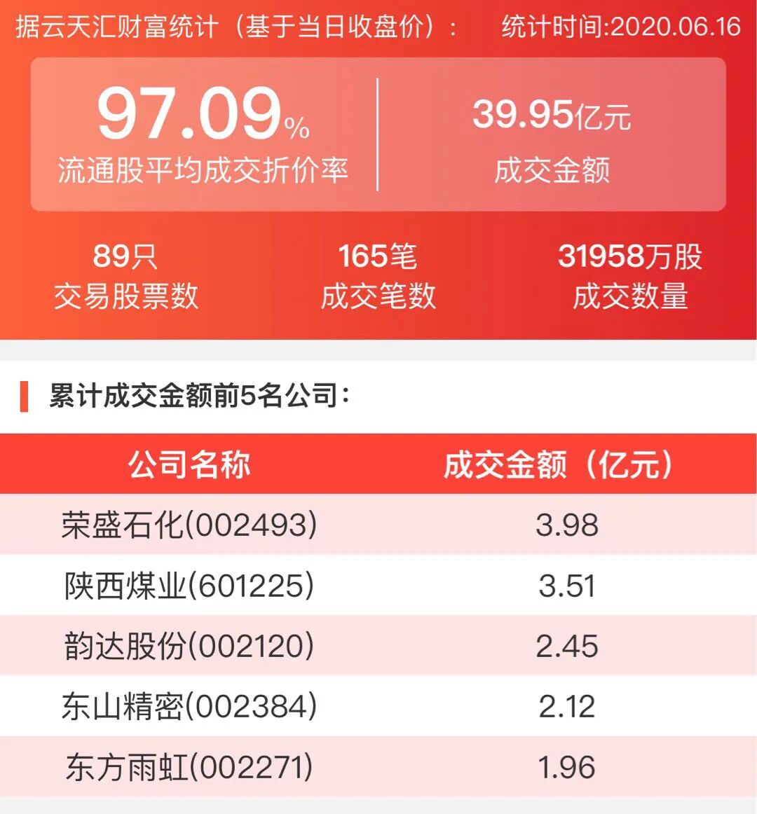 2020年6月16日,大宗交易成交金额39.95亿元,交易股票数89只,成交笔数165笔,流通股平均成交折价率97.09%,成交数量31958万股。