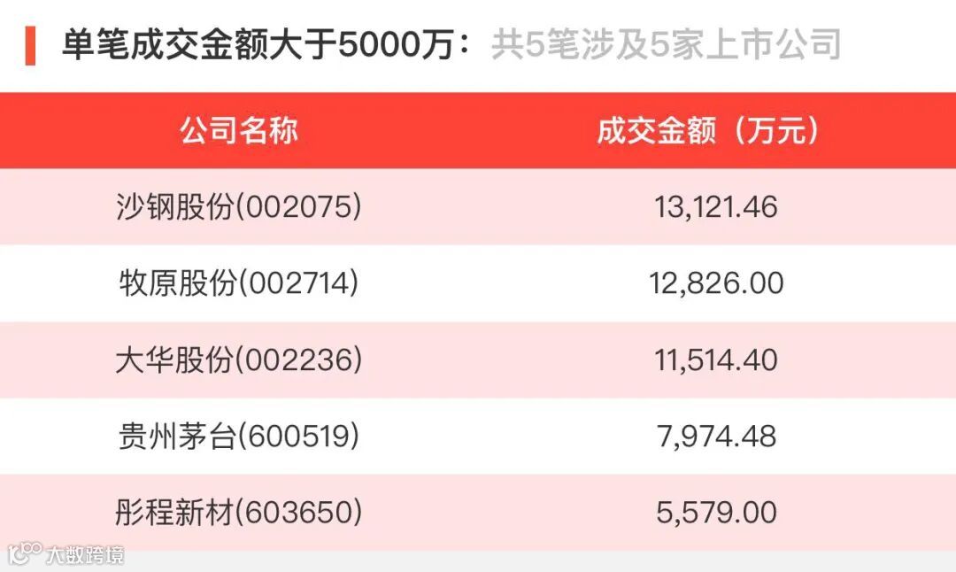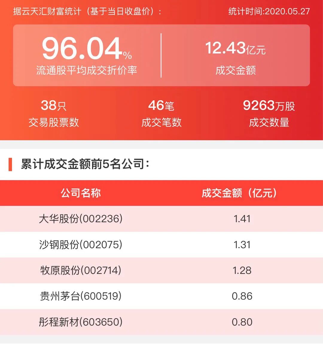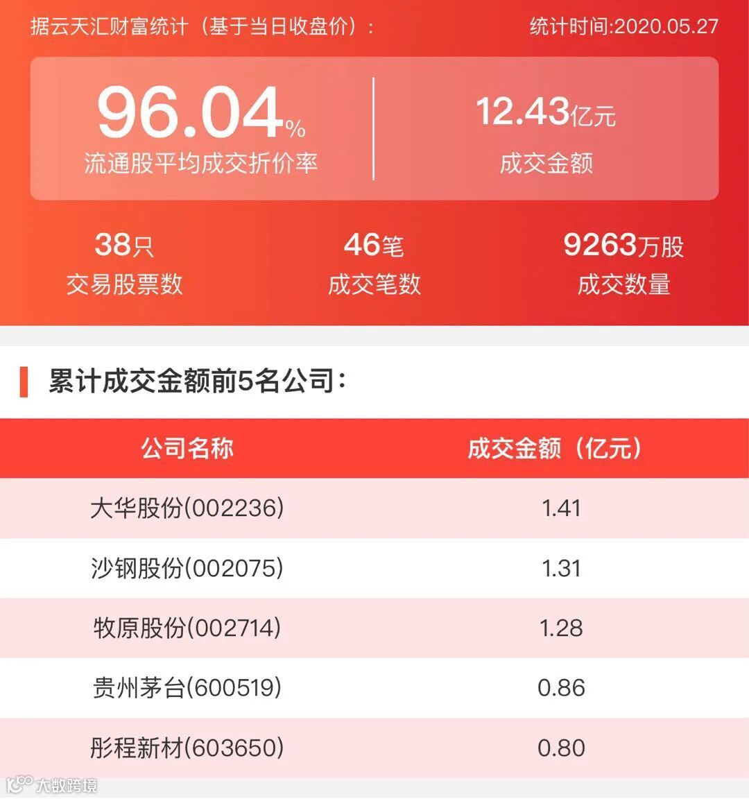 2020年5月27日,大宗交易成交金额12.43亿元,交易股票数38只,成交笔数46笔,流通股平均成交折价率96.04%,成交数量9263万股。