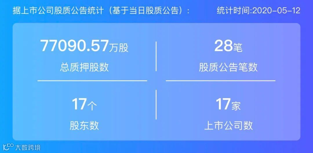 2020年5月12日,股票质押总质押股数77090.57万股,上市公司数17家,股质公告笔数28笔,股东数17个。
