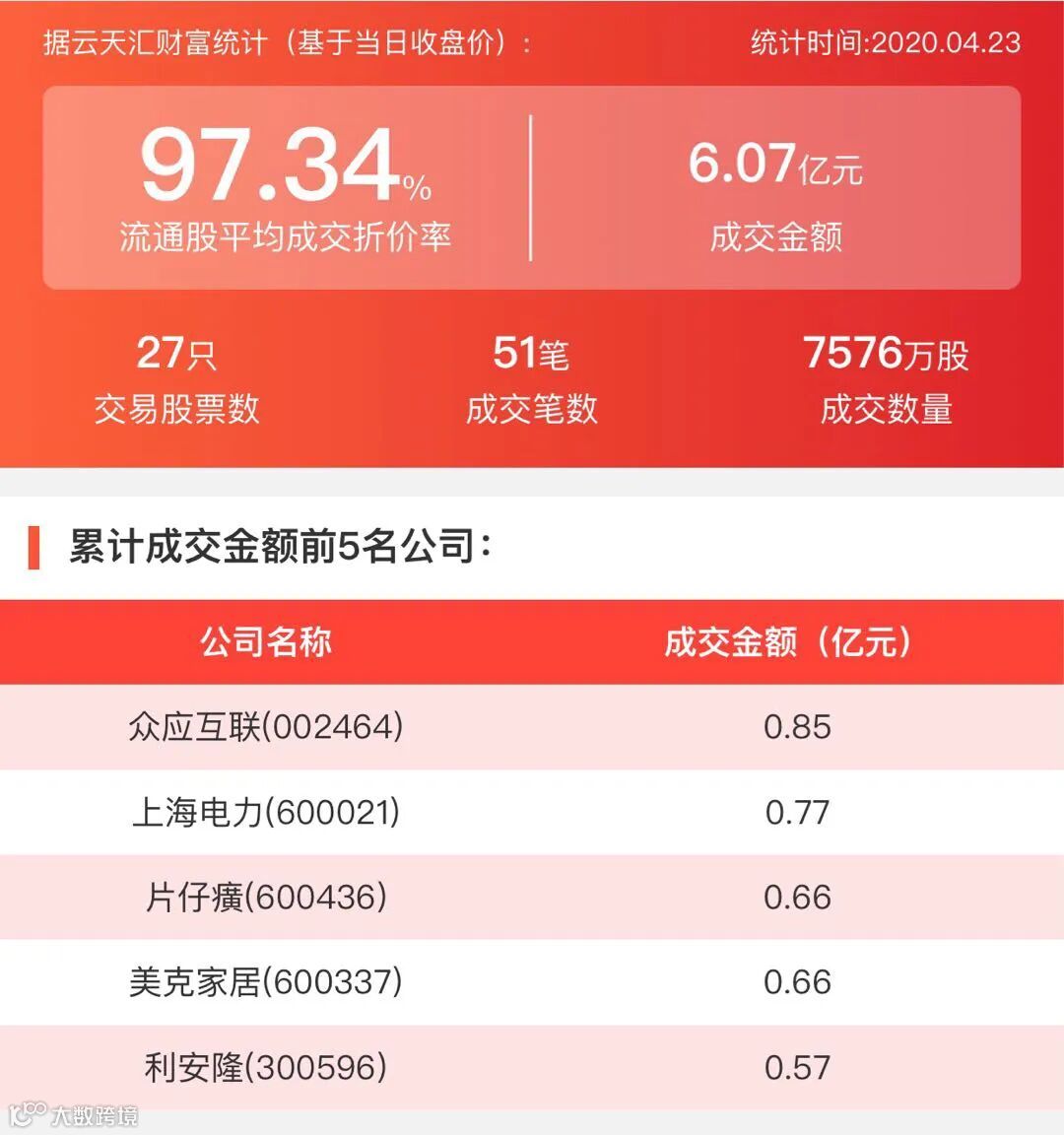 2020年4月23日,大宗交易成交金额6.07亿元,交易股票数27只,成交笔数51笔,流通股平均成交折价率97.34%,成交数量7576万股。