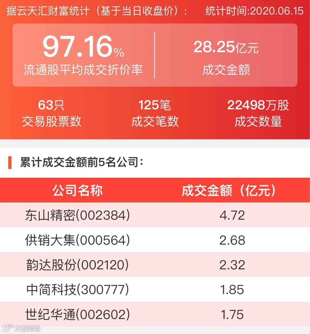 2020年6月15日,大宗交易成交金额28.25亿元,交易股票数63只,成交笔数125笔,流通股平均成交折价率97.16%,成交数量22498万股。